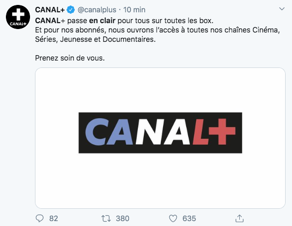 4. Dans un tweet clair, net et précis, Canal + annonce passer en clair sur toutes les box et ouvre l'accès à l'ensemble des chaînes Cinéma pour leurs abonnés :