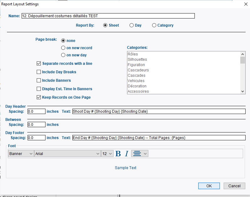 Bonjour à tous, Je vous explique rapidement ma situation et vous présente le point où j'ai besoin d'un coup de main. Je rejoins un projet en cours et j'en profite pour refaire une passe de dépouillement sur MMS suite à la dernière version du scénario. Je constate que pour le dépouillement Costumes, chaque élément se nomme "NomDuPersonnage C Num°DuCostume" (ex : Antoine C1, Nathalie C3) et que le détail des costumes s'obtient dans "Notes" après un double clic sur l'élément. Evidemment je veux faire apparaitre sur mon report "dépouillement costumes" l'intitulé du costume mais aussi le détail situé dans Notes. Là, on rentre dans le technique : dans mon layout j'ai une première case [Costumes:Element Name] suivi par une case [Costumes:Notes]. Ca me donne au mieux, avec un "Growable" une liste de tous les costumes puis à la suite une liste de toutes les notes ensembles (si j'ai suffisament agrandi la case [Costumes:Notes] car le "Growable" ne fonctionne pas bizarrement). Dans le cas où je désactive le "Growable" et où je réduit les cases j'ai uniquement le premier costume suivi de ses notes ! BINGO sauf que la suite se trouve en page 2 du report puis en page 3 puis en autant de page qu'il y a de costumes. Idéalement j'aimerais avoir pour chaque page quelque chose comme ça : Scène 001 INT BUREAU NUIT J1 Rôles Costumes Antoine Nathalie Antoine C1 Pull noir col en V, jean, chaussures noires Nathalie C3 Chemisier fleur, boucles d'oreilles, talons hauts Je vais tenter en stripboard, je vais peut-être réussir à faire quelque chose de lisible mais si quelqu'un à une idée pour un report je suis preneur ! N'hésitez pas à dire si je suis pas clair ! Bonne journée ! :D